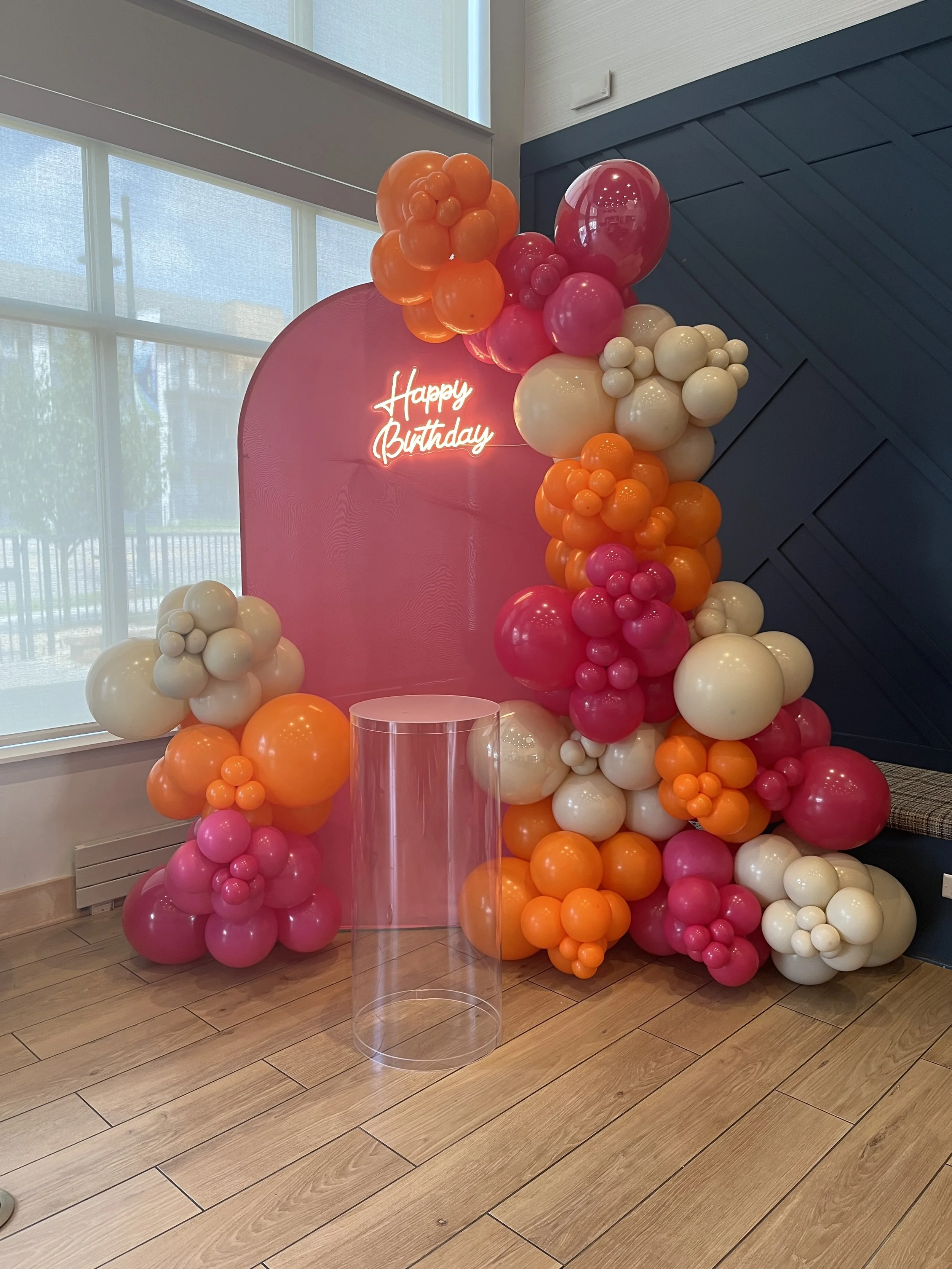 (Pictured is a 7.2ftx 7.2ft round arch with a 14ft balloon garland)